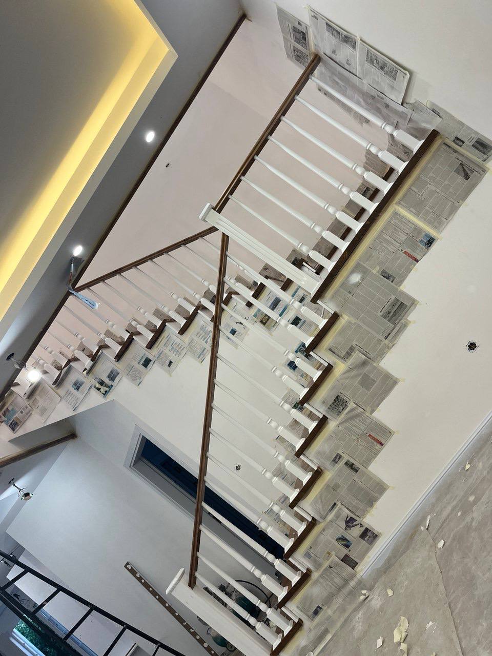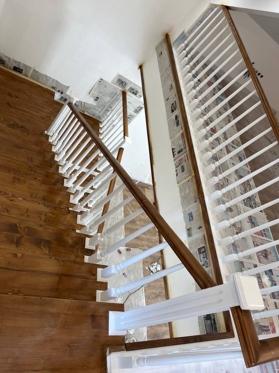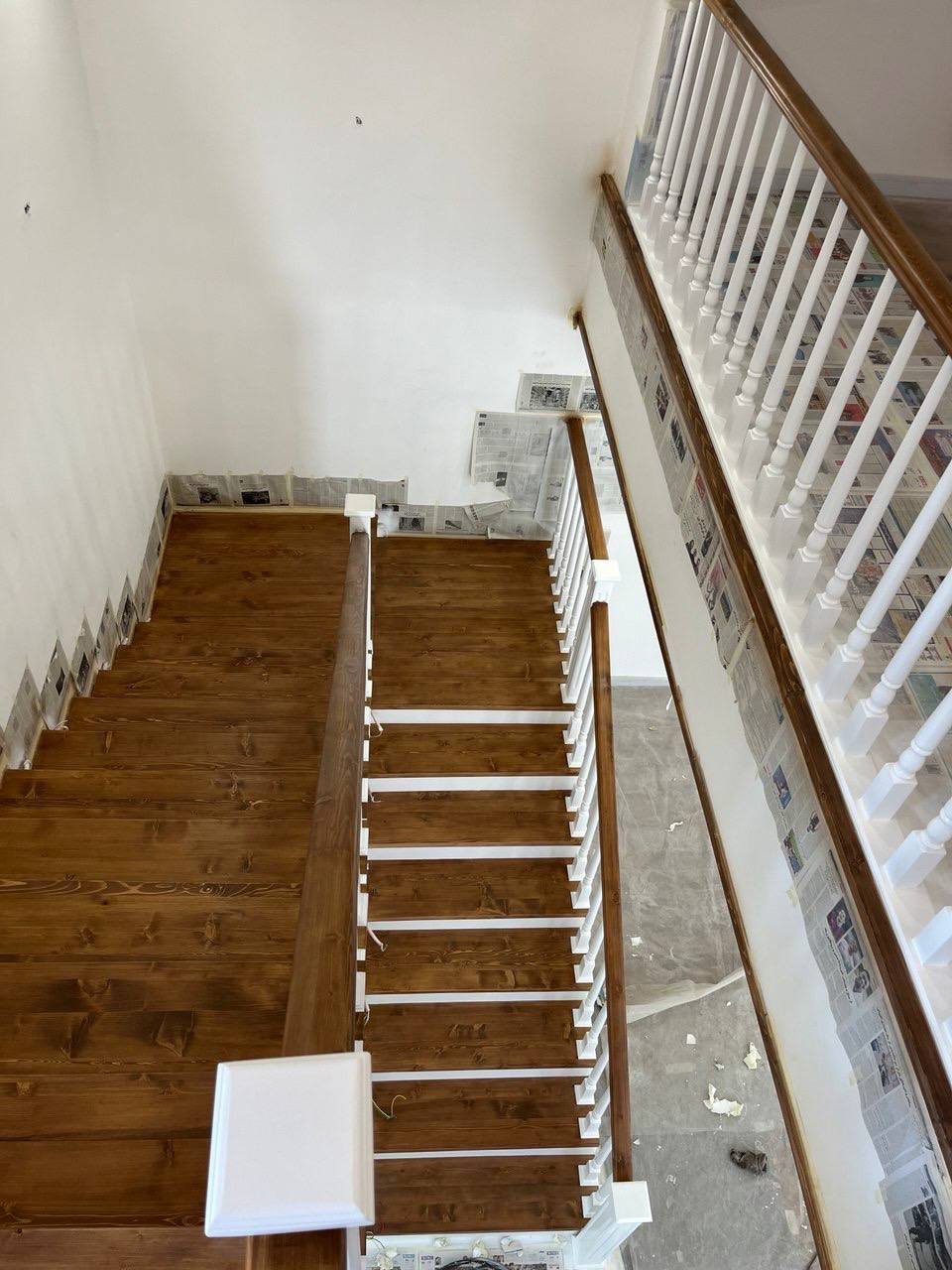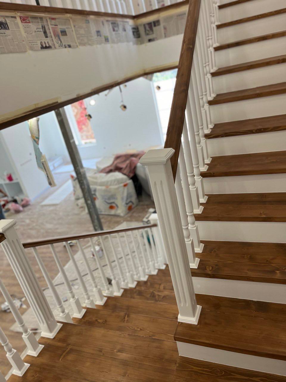 پروژه نرده چوبی نیو کلاسیک از جنس روسی که از دو رنگ مکمل هم در طراحی ان استفاده شده و قطر نرده های ان 6.5 cm است تا ظریف تر به نظر بیاد .